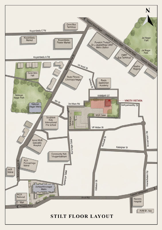 The property features 3 BHK apartments ranging from 1307 sq.ft – 1876 sq ft.,Near Natesan Nagar Metro in heart of Saligramam Location, ' Vinoth Vistara" the locality is strategically positioned near major roadways, making it easily accessible from various parts of Chennai and neighbouring districts.